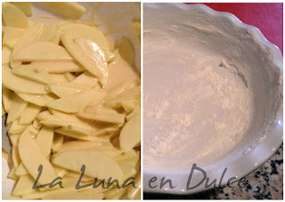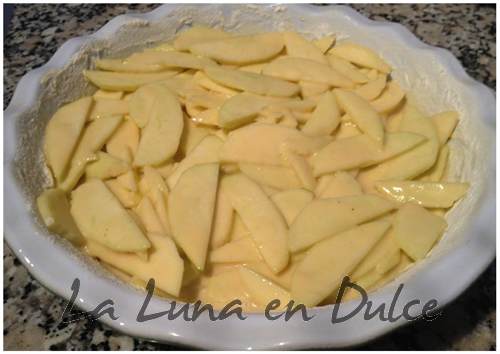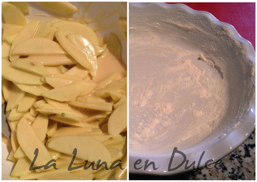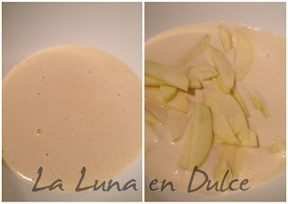 6.Pelar las manzanas y cortar en láminas finitas. Según vayamos cortando mezclar con la masa para que no se oxiden y se pongan feas. La cantidad de manzanas puede variar según el tamaño de éstas.