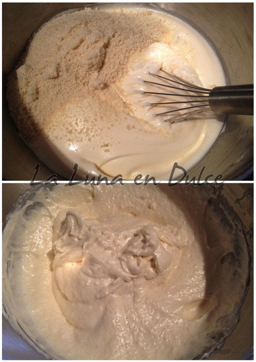 6.Agregar ahora las almendras molidas y la levadura, y manualmente con cuidado y movimientos envolventes batir la mezcla hasta que esté todo bien incorporado.