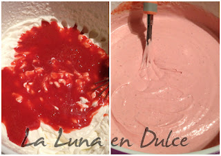 7.Verter nuestra mezcla de fresas y gelatina sobre la nata, y con cuidado mezclar completamente.