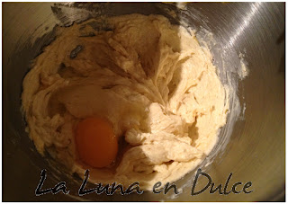 4.Poner en el bol de la amasadora, Kenwood en mi caso, la mantequilla con los dos tipos de azúcar, batir hasta que la mezcla haya blanqueado, con el azúcar disuelto y una textura cremosa.
