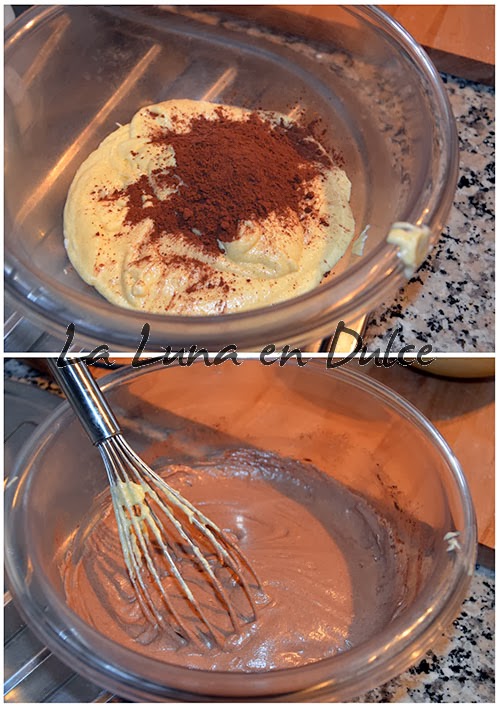 7.Dividir la masa en dos partes iguales. En uno agregar la vainilla y mezclar bien, en el otro agregar el cacao en polvo y batir hasta integrar bien.