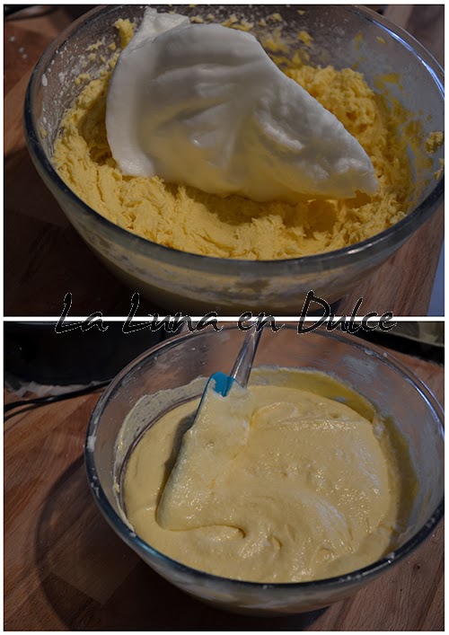 6.Incorporar las claras a punto de nieve a la mezcla anterior, y con una espátula mezclar cuidadosamente con movimientos envolventes de abajo a arriba, para que se bajen lo menos posible.