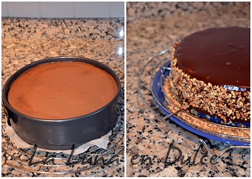 18.Poner el bizcocho boca abajo en una rejilla (para que la parte más lisa que es la inferior quede arriba), y bañar con la cobertura.