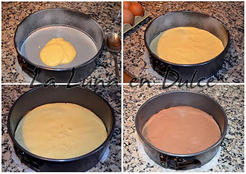 10.Comenzamos a hornear las capas de bizcocho. Tomar dos cucharas soperas de masa blanca, y distribuir sobre el molde, dejando una capa muy finita, como si fuera un crepe.