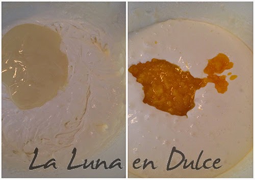 11.Con la batidora en funcionamiento agregar nuestro almíbar con gelatina, y batir hasta que esté bien repartido.