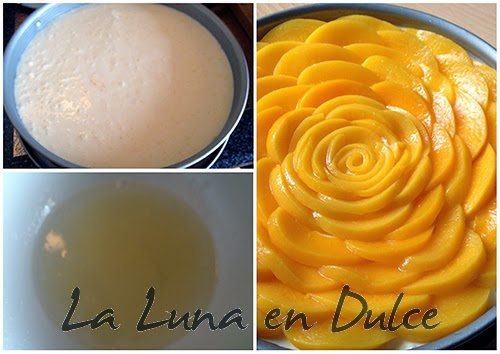 14.COBERTURA:Cortar los melocotones, como podéis ver en las fotos, e ir colocando primero en el exterior de la tarta e ir cubriendo el borde exterior de la tarta.