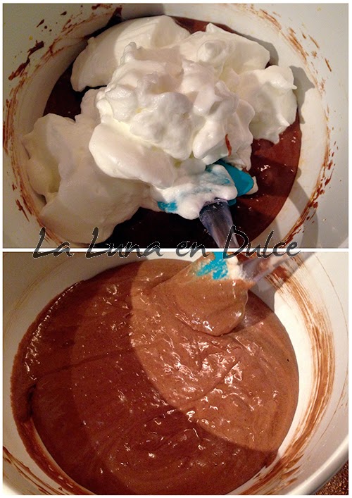 10.Incorporar las claras de la masa reservada, y con una espátula haciendo movimientos envolventes mezclar bien, hasta que esté completamente integrado.