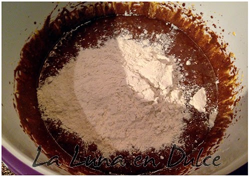 8.Verter esta mezcla en el chocolate reservado y la harina tamizada. Batir hasta integrar bien. Reservar.