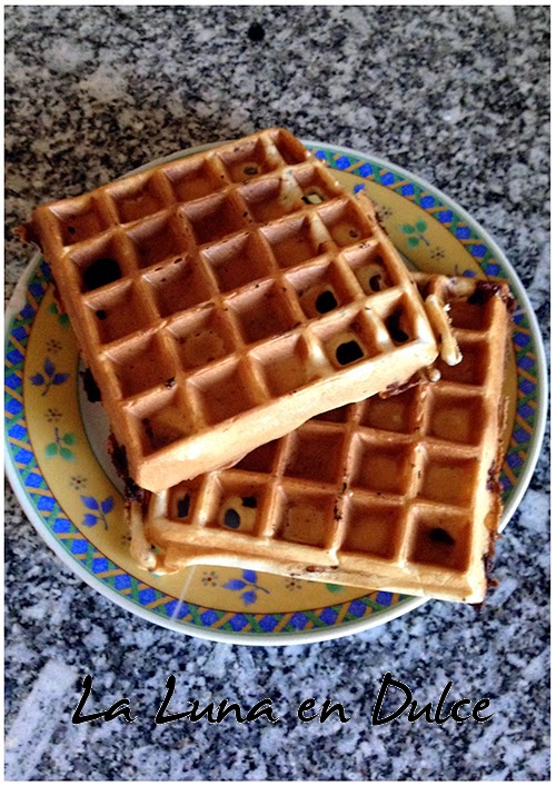 Estos ricos gofres los hice anoche, en casa nos apetecía "guarrear" un poco, y la verdad es que como la masa se hace tan rápido, pues son ideales para una merienda improvisada o para un postre rápido. En mi caso los hice de postre para la cena.