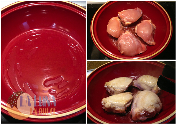 2. Salpimentar el pollo y freír hasta que empiece a dorarse. Retirar y reservar.