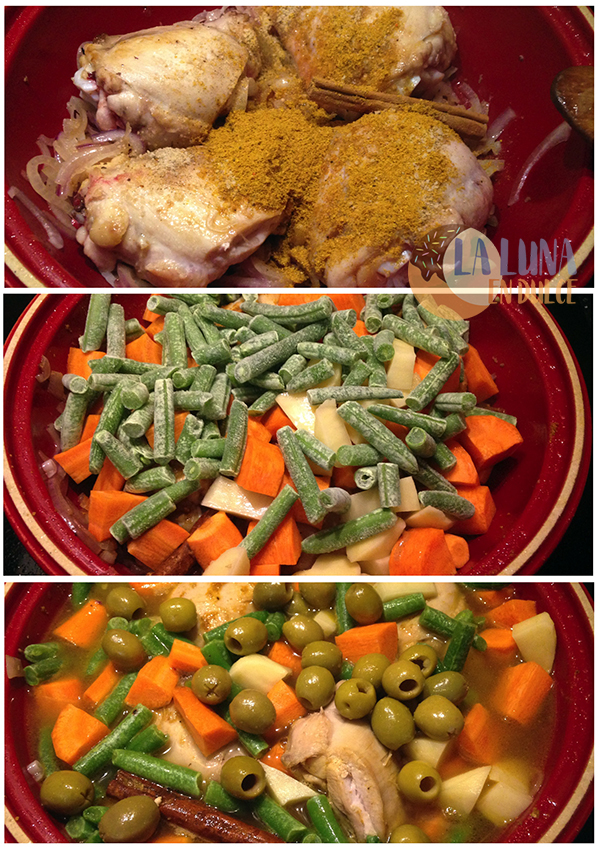 5. Incorporar las zanahorias, las judías, las patatas y las aceitunas por encima del pollo, añadir la rama de canela, cubrir con el agua y tapar. Asegurarnos que el pollo y las verduras están cubiertas casi del todo con el agua.