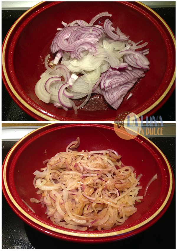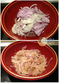 3. Pelar y trocear las cebollas en tiras, y freír en el mismo aceite hasta que empiecen a mocharse y veamos que quedan transparentes.