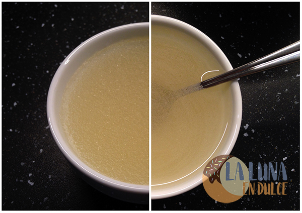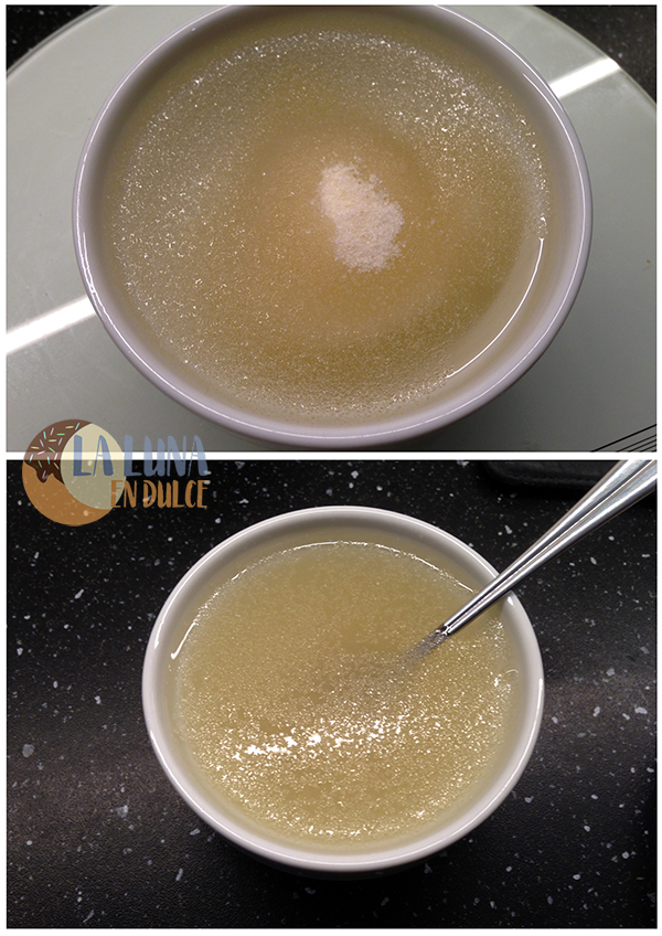 8. Gelatina de melocotón: De nuevo mezclar los 100ml de agua con la gelatina en polvo, dejar hidratar.