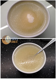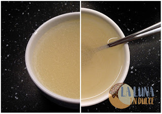 5. Calentar en el microondas la gelatina hidratada durenta unos 10 o 15 segundos, podremos ver que se vuelve líquido. NO DEBE HERVIR, porque entonces no serviría.