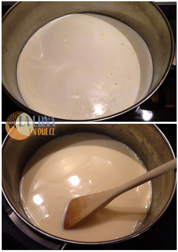 6. Verter esta gelatina en el cazo de leches calientes, y mezclar hasta que la gelatina esté bien integrada.
