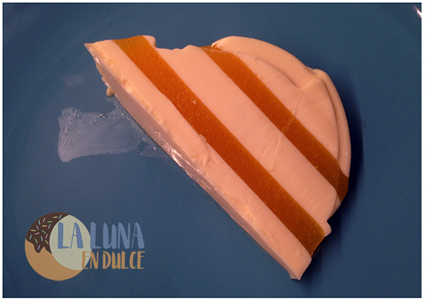 15. Con la ayuda de un cucharón, que pegaremos los máximo posible a la capa anterior, verter un poco de gelatina de melocotón, muy poco a poco para no romper la capa de la gelatina anterior.