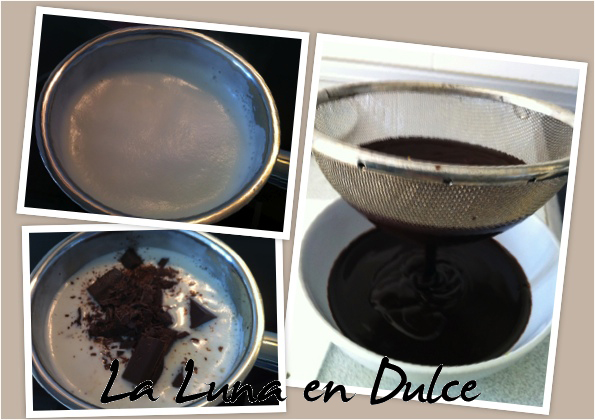 **.En un cazo verter 150ml de nata y llevar a ebullición.Cuando comience a hervir apartar del fuego y verter sobre el chocolate. Dejar reposando unos 5 minutos para que el chocolate se derrita por completo. Pasado este tiempo remover con una cuchara de madera hasta que esté todo bien integrado.