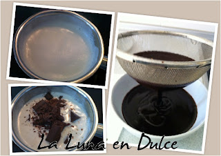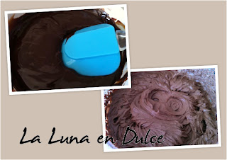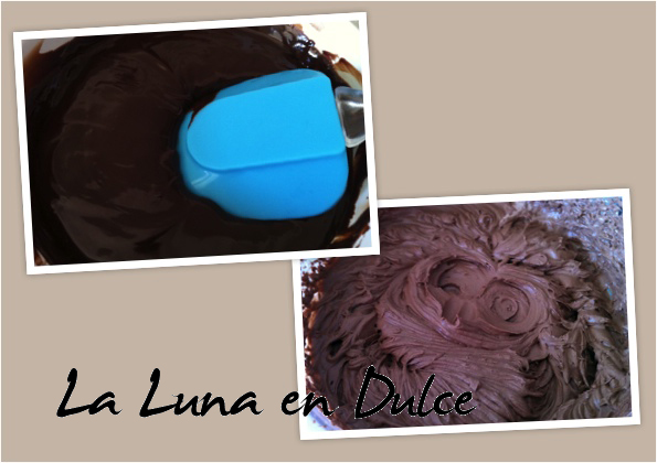 Pasar la mezcla por un colador para eliminar cualquier trocito que nos haya quedado y dejar templar para después meter en la nevera.Cuando la mezcla de chocolate ya esté fresca o fría, verter en otro bol el resto de nata y el azúcar y comenzar a batir hasta que empiece a coger algo de cuerpo, oséa que deje de estar tan líquida. Añadir 2 cucharadas de la mezcla del chocolate, y batir unos segundos para mezclar.