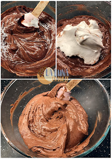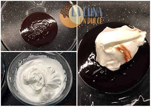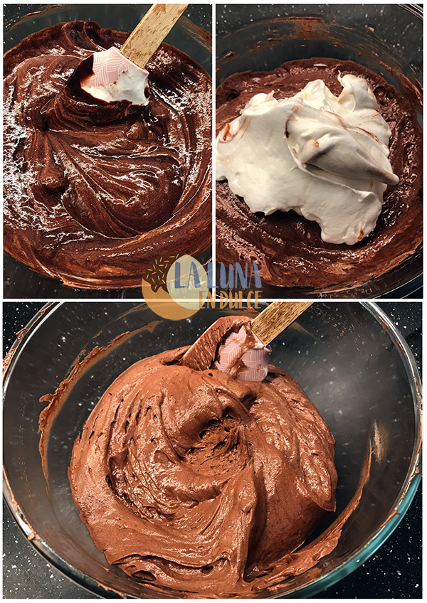 6. Poner la mezcla de chocolate en un bol, e ir añadiéndole poco a poco el merengue. Ir mezclando con una espátula, haciendo movimientos envolventes para que se baje lo menos posible.