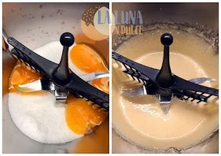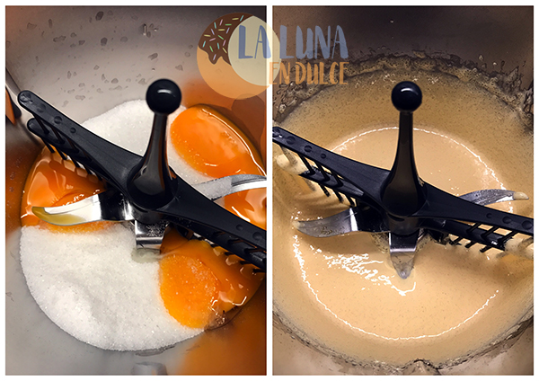 9. MOUSSE DE CAFE: Colocar en el vaso de la thermomix la mariposa, y verter las yemas y el azúcar, batir a velocidad 3 y 1/2 hasta que la mezcla haya blanqueado, serán unos 2 o 3 minutos.