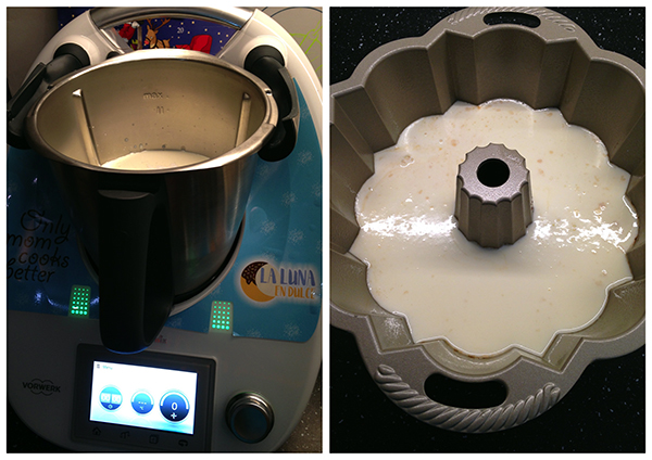 2. Mientras tenemos la thermomix trabajando ponemos un poco de spray anti adherente al molde, y justo después lo caramelizamos con los 70-80g de caramelo.