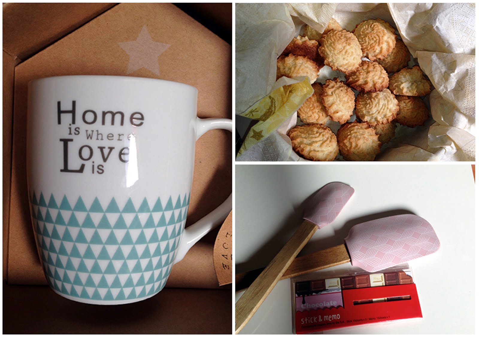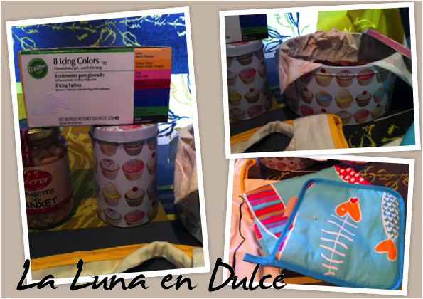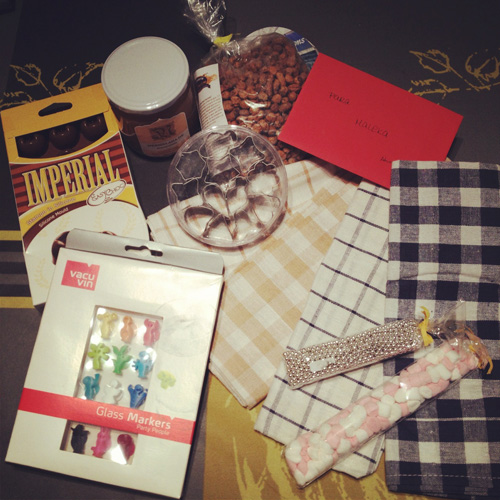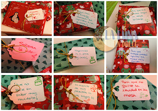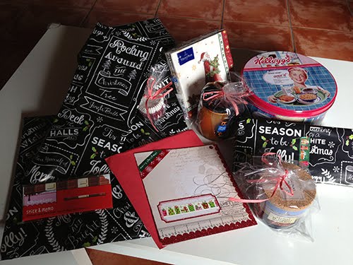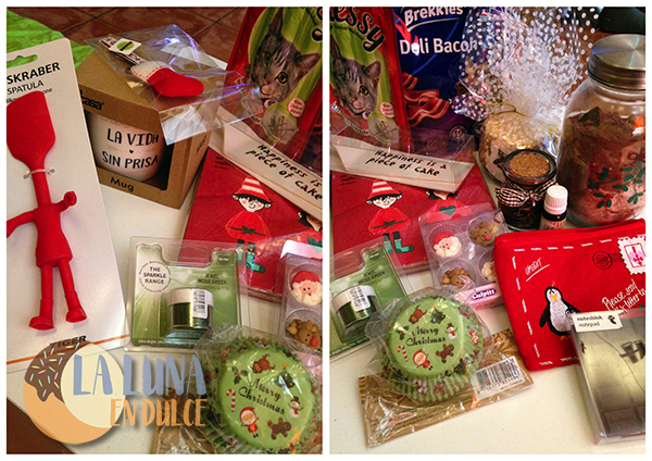 Empecé a abrir todos esos paquetitos para encontrar cosas maravillosas: una espátula roja de goma con piernas y brazos graciosísimo, una taza con el mensaje "Saborea la vida sin prisa", una bota roja para colgar en el árbol de Navidad, unas servilletas de para Navidad, cápsulas para cupcakes, purpurina verde comestible, unos adornos de azúcar con formas de caritas de renos y Papá Noel, esencia de turrón, y té riquísimo, una mermelada de melocotón hecha por ella, un pequeño estuche que es como si fuera un sobre - preciosismo, un bloc de de notas como si fuera una tableta de chocolate, unos premios para Harry, Bosco y Zoe y la mezcla de ingredientes secos de unas "Brownie Cookies" a las que yo aportaré los ingredientes húmedos, y así hacer la receta entre las dos!! Me rechifla esto de hacer la receta entre las dos!! No tardaré en hacerlas, y os mostraré el resultado.